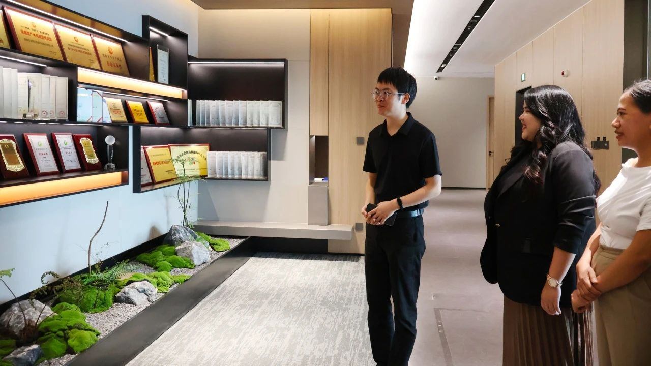 基于对菲律宾智慧金融市场的关注,海龙国际自2024年起,开始与菲律宾客户接触沟通,就具体业务需求进行了多轮深入交流。海龙团队充分发挥技术优势,为菲律宾两家企业提供了金融系统定制化的技术开发支持,旨在帮助其提升产品运营服务与信审能力。这一阶段务实、高效的沟通,为后续合作奠定了良好开端。 ▲ 曾博士向外宾介绍企业资质专利