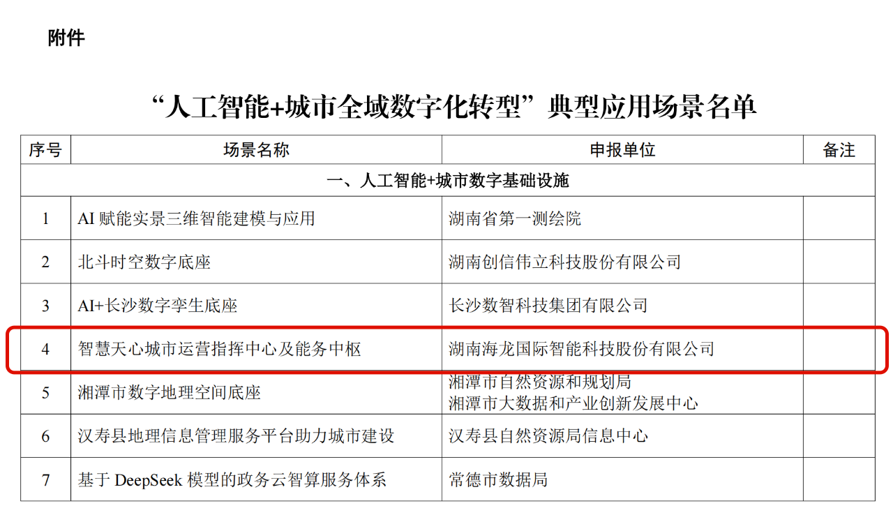 - 喜报!海龙国际入选湖南省“人工智能+城市全域数字化转型”典型应用场景